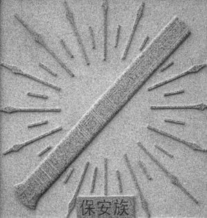 保安族擅長(zhǎng)打刀技術(shù),所產(chǎn)刀具構(gòu)造精巧、質(zhì)量上乘,工藝獨(dú)成一體,被稱為“保安腰刀”。保安人打制腰刀具有800多年的歷史,公元13世紀(jì)成吉思汗東征時(shí),把部分來自中亞的官兵和工匠留在青海同仁地區(qū)。這部分色目人與當(dāng)?shù)孛晒?、漢、回、藏、土等民族相鄰而居,相互交流融合,逐步形成了今天的保安民族。保安族發(fā)揮擅長(zhǎng)冶鐵技術(shù)的特長(zhǎng),所生產(chǎn)的腰刀不僅自用,還成為與蒙古、藏、回等民族交換牛羊和日用品的商品,因此逐漸聞名于世。