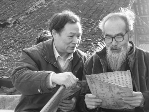 丹寨縣水書師潘廣禮(右)向潘朝霖解讀祖藏水書 吳欣供圖