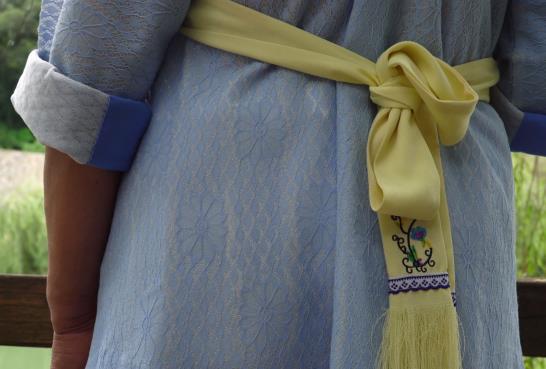 斜襟短衣外的圍腰上部與斜翼兩側(cè)鳥(niǎo)獸花紋,圍腰大部分為純色,色彩選擇較多。而垂在腰后的彩帶尾部有流蘇,助以美觀(guān)和裝飾。