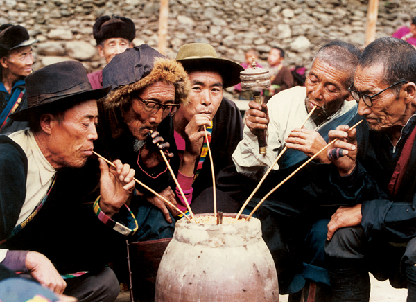 男女老少皆喜歡家釀的咂酒。青稞、大麥或玉米釀成酒,封于壇中,用時(shí)啟封,注入開(kāi)水,插上竹管,輪流吸咂,邊飲邊加清水,直至味淡。普遍吸蘭花煙。
