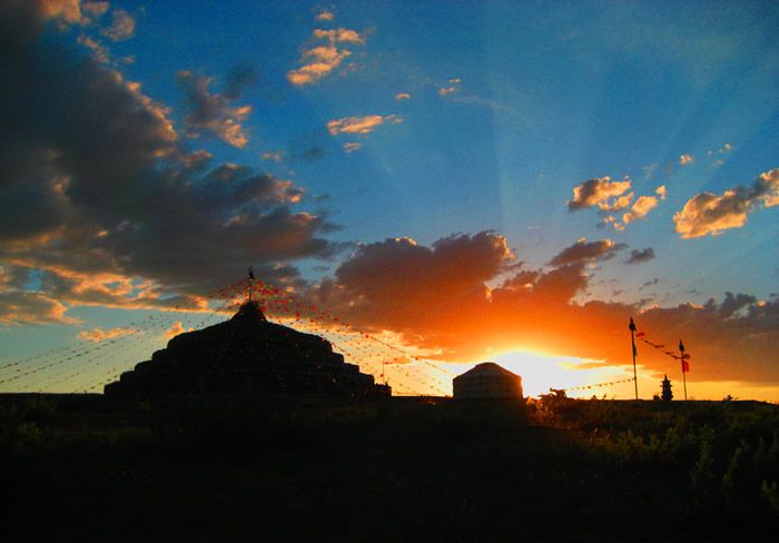 旅游中心所祭祀的“格根查干敖包”,原本屬于本土牧民祭祀的古老部落扎薩克敖包,曾經(jīng)由博教(薩滿教)大師開光,后來的佛教高僧對(duì)這座敖包又融入了符咒,實(shí)屬擁有“靈性”的正宗敖包。旅游中心為了充分展示遠(yuǎn)古敖包文化的魅力,按照蒙元時(shí)期形成的敖包規(guī)則予以拓展,即以故有的敖包為核心,由12座統(tǒng)一的小敖包,分布于規(guī)則的圓周線上,簇?fù)碇黧w敖包。蒙古族歷來崇尚數(shù)字的“13”,認(rèn)為這個(gè)數(shù)字既是成功的起點(diǎn),又是萬事大吉的象征。這種由“13”組合而成的敖包寓意深刻,“10”是一個(gè)整數(shù),有整合之意,“3”是一個(gè)全數(shù),即代表著天、地、人的統(tǒng)一體,象征著完美無缺的蒼天之力。源于遠(yuǎn)古時(shí)期的博教,根據(jù)其長(zhǎng)生天學(xué)說“上蒼有99重天,下有人間輪相屬年和諧共存”之理念,主體敖包的石壁上制有祭典長(zhǎng)生天的99盞燈座,體現(xiàn)著其三元結(jié)構(gòu)的完美與蒙元時(shí)期正宗敖包的風(fēng)采和神威。