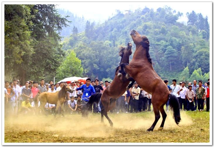 斗馬節(jié)這一天,縣城笙歌震天,鐵炮、粉槍齊鳴。穿著節(jié)日盛裝的各族群眾興高采烈,跳起歡快的蘆笙踩堂舞。這時(shí)精神抖擻的苗家馬主,牽著各自的馬匹,從四面八方云集斗馬場(chǎng)。先由馬主拈鬮分組初賽,兩兩相斗,出線者參加復(fù)賽和決賽,決出最后名次。對(duì)獲勝者評(píng)出一、二、三名,給戰(zhàn)馬披紅掛彩。