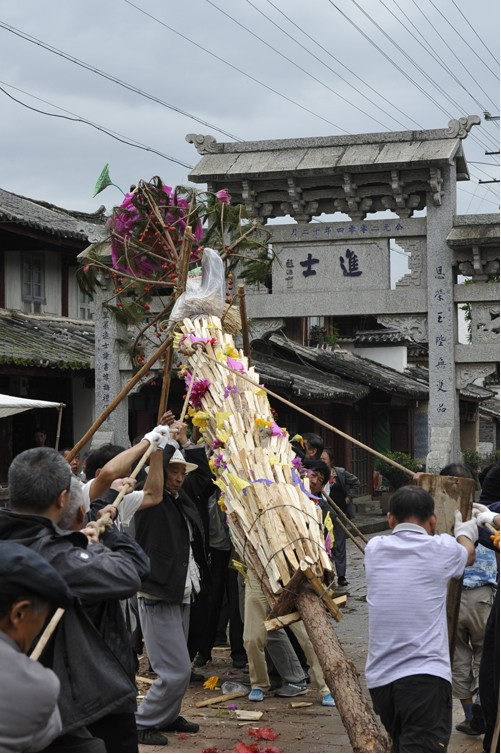 在劍川,都是由家里喜添子嗣的人家來籌備火把節(jié)的一切事宜,除了對新生兒的祝福,火把樹的裝扮也表示劍川人祈愿風調(diào)雨順,人壽年豐、鄰里和諧。火把要扎十二層(閏年要扎十三層),上面六層的明子和柴分別由細到粗,一層接著一層,下面七層都是一樣的新柴。喻示每一個新的日子都紅紅火火。