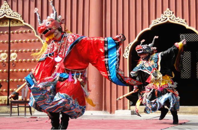 內(nèi)蒙古地區(qū)的查瑪樂(lè)舞已與藏族地區(qū)的“羌姆”明顯不同。隨著藏傳佛教傳入蒙古地區(qū)后,積極地吸收和融合了蒙古族傳統(tǒng)音樂(lè)舞蹈和薩滿教神舞的因素后形成了蒙古化的查瑪樂(lè)舞。因此,內(nèi)蒙古地區(qū)的查瑪具有復(fù)合型和多元性特點(diǎn)。2008年,查瑪樂(lè)舞被列入國(guó)家級(jí)非物質(zhì)文化遺產(chǎn)。
