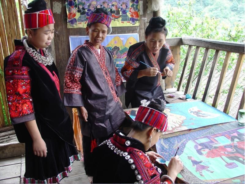 劍河現(xiàn)代民間繪畫(huà)源于傳統(tǒng)的苗族刺繡文化,是苗族刺繡文化的另一種表現(xiàn)形式和藝術(shù)升華。傳統(tǒng)的苗族文化多以服飾、歌舞為載體,并以刺繡及演唱等形式進(jìn)行表現(xiàn)和傳承。早期劍河現(xiàn)代民間畫(huà)即脫胎于具有適用性的苗族刺繡樣稿——剪紙和手繪刺繡粉本,換言之,手繪的苗族刺繡粉本便是劍河現(xiàn)代民間繪畫(huà)的雛形,劍河第一批優(yōu)秀的現(xiàn)代民間畫(huà)作者,即是原當(dāng)?shù)厥掷L粉本的能工巧匠。劍河現(xiàn)代民間繪畫(huà)多以苗族神話(huà)傳說(shuō)中的故事情節(jié)和民俗節(jié)日、生產(chǎn)活動(dòng)等內(nèi)容為題材入畫(huà),素材涵蓋自然界花鳥(niǎo)蟲(chóng)魚(yú)及人物、家畜等具體形象,造型稚拙天真,設(shè)色濃艷,對(duì)比強(qiáng)烈。作品傳達(dá)出典型的地域民俗氣息及濃厚的鄉(xiāng)土味,便是其標(biāo)志性特征。