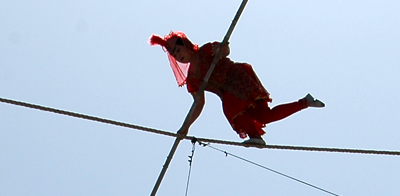 “達(dá)瓦孜”既是少數(shù)民族傳統(tǒng)體育運(yùn)動(dòng)表演項(xiàng)目,也是節(jié)日里娛樂(lè)活動(dòng),它有雜技和體育的雙重特點(diǎn)?!斑_(dá)瓦孜”高空走繩表演十分壯觀,在空曠的場(chǎng)地上,中間聳立三十多米高的立桿,頂處扎一牌樓上掛彩旗。牌樓橫桿兩端有表演用的吊杠和吊環(huán)。表演技能的繩索長(zhǎng)八十多米。表演者手持長(zhǎng)約6米的平衡桿,不系保險(xiǎn)帶,在繩索上作前后走動(dòng)、盤(pán)腿端坐、蒙眼行走,甚至腳踩碟子、飛身跳躍等一系列驚心動(dòng)魄的動(dòng)作。經(jīng)過(guò)不斷實(shí)踐和發(fā)展,“達(dá)瓦孜”表演技巧有了新突破,在濃郁民族風(fēng)味維吾爾族民間樂(lè)曲伴奏中,表演者輕松自如地在、高空繩索上踏著節(jié)拍跳舞歌唱,并且敏捷地變換著高難動(dòng)作。