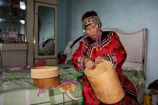 鄂倫春族素有“白樺民族”之稱,白樺樹皮制品種類非常多,大到可以乘人載物的樺皮船、圍蓋“仙人柱”的“鐵克沙”,小到可以裝在衣兜里的煙盒和含在口中的狍哨,提水用的桶、采集用的簍、裝物用的箱、盛飯用的盆、吃飯用的碗、喝酒用的蠱等等。樺樹皮制品的裝飾圖案可以通過壓劃、壓?。c(diǎn)刺)、剔刻、烙燙、補(bǔ)花、繪畫等多種方法形成。壓印點(diǎn)刺是最常用的裝飾手段,工具是用獸骨制成的,分單齒、雙齒、多齒和簡單幾何形幾種。先在剪裁好的器物材料上,用壓、打等方法點(diǎn)刺出裝飾紋樣,再縫合成器物成品。這種裝飾多為素面凹形花紋,顯得樸實(shí)單純,而且器物越陳舊樺皮顏色越深,越有光澤,圖紋越清晰。也有人在壓打線上著色,這便形成了另一種風(fēng)格,美觀艷麗而且突出了物象特征。