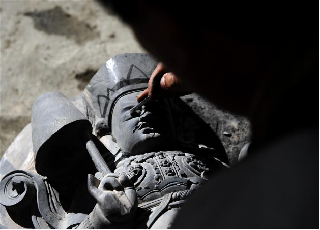伴隨著收音機(jī)傳出的旋律,西藏自治區(qū)級(jí)黑玉石雕刻技藝非物質(zhì)文化遺產(chǎn)傳承人土登加措和他的徒弟們開(kāi)始了又一天的黑玉石佛像雕刻工作。黑玉石產(chǎn)生于海拔4500米以上的石山上,是高原特有的一種石材。據(jù)古書記載,西藏第一代藏王聶赤贊普曾將天降的經(jīng)書、塔模等佛教圣物封存于洞中,并以黑玉石雕刻佛塔做蓋,于是便有了西藏歷史上有記載的第一件黑玉石雕刻作品。作為這門技藝的第五代傳人,土登加措延續(xù)著家族的技藝,一直傳承著這門古老的技藝。西藏黑玉石雕刻技藝在2012年入選第四批西藏自治區(qū)級(jí)非物質(zhì)文化遺產(chǎn)名錄,土登加措如今已有近30名弟子,古老的黑玉石雕刻技藝正在慢慢走向世界。新華社記者 晉美多吉 攝