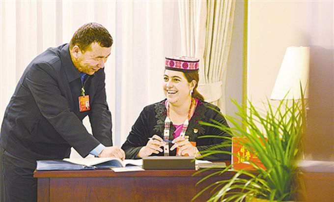 黨的十九大新疆代表團駐地里,米日姑麗·艾克米汗和吾布力喀斯木·買吐送代表(維吾爾族)談起五年來家鄉(xiāng)的巨大變化非常開心,“百姓富了,家鄉(xiāng)美了,來自全國的客人也多了” (高興貴 攝影)