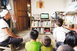 黎友明給孩子們看自己拍的水稻紀錄片。