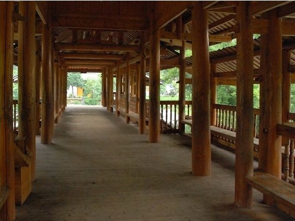 風雨橋以石拱木作,廊、屋、亭、閣為一體,造型別致、美不勝收。無論是遠眺還是進觀,都體現(xiàn)出獨特的審美意境。鏈接廊橋與屋亭的是長條青石,橋與村寨的連接則用花石鋪路,橋面主體是當?shù)厮寄静?。這種自然生態(tài)環(huán)保的理念,更彰顯了瑤族人民獨特的審美境界。