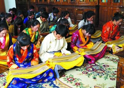 西藏藏醫(yī)學院的學生正在研讀記載著藏醫(yī)藥浴法相關知識的《四部醫(yī)典》。劉罡 攝