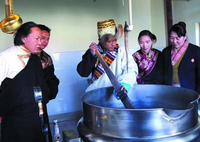 該遺產(chǎn)項目代表性傳承人明珠(左)指導瀧沐覺堪(制藥師)煎熬“五味甘露”。關確才讓 攝