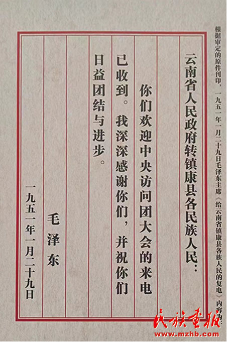 毛主席給鎮(zhèn)康人民的回電。