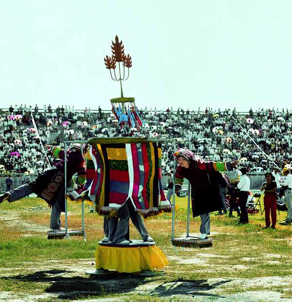 輪子秋,土語稱“卜日熱”,是土族人在農(nóng)閑時(shí)舉行的一種體育活動(dòng),主要在青?;ブ磷逡粠Я餍小C磕甓灸胪陥龊?,特別是春節(jié)期間,人們在平整寬敞的麥場或其他可以利用的場地上,把馬拉大車的車棚卸下來,將輪和軸整體豎起,然后將抵在地上的輪上壓上石頭等重物,固定重心。隨后,在上面的輪子上橫著綁一架三四米長的梯子,兩端各綁一個(gè)U形的秋千坐套。人坐在坐套內(nèi),由他人推動(dòng)轉(zhuǎn)圈?,F(xiàn)在許多土族村莊,每年還要舉行輪子秋比賽。比賽時(shí),兩人各坐于座套上,然后推動(dòng)木梯,使之快速轉(zhuǎn)動(dòng)。參賽者可表演“雄鷹展翅”“金雞獨(dú)立”“孔雀開屏”“猛虎下山”“金鐘倒掛”“蛟龍出海”等驚險(xiǎn)的高難度空中動(dòng)作。比賽常以轉(zhuǎn)時(shí)長、頭不暈、眼不花、站立較穩(wěn)當(dāng)?shù)霓D(zhuǎn)秋者為優(yōu)勝者。近年來,輪子秋已被列為全國農(nóng)民運(yùn)動(dòng)會(huì)和民族運(yùn)動(dòng)會(huì)的表演或比賽項(xiàng)目。輪子秋也得到改進(jìn),現(xiàn)多用鋼管為原料焊接,還裝上了滾珠軸承,使用更加安全。