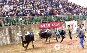 貴州省從江縣第十五屆原生態(tài)侗族大歌節(jié)的前一天,恰逢該縣逢亥斗牛日,丙妹鎮(zhèn)松學(xué)斗牛塘、谷坪鄉(xiāng)四寨河斗牛塘同時(shí)舉辦傳統(tǒng)牛王爭(zhēng)霸賽,喜迎一年一度“侗族大歌節(jié)”的到來(lái),共有來(lái)自周邊村寨的80頭水牯牛參戰(zhàn),斗?;顒?dòng)場(chǎng)上名牛角逐,場(chǎng)面異彩紛呈,吸引數(shù)萬(wàn)名觀眾前來(lái)觀戰(zhàn)。
