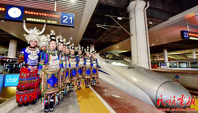 用少數(shù)民族禮儀歡送貴陽(yáng)北站首開G4135次至昆明的高鐵(李勇 攝影)