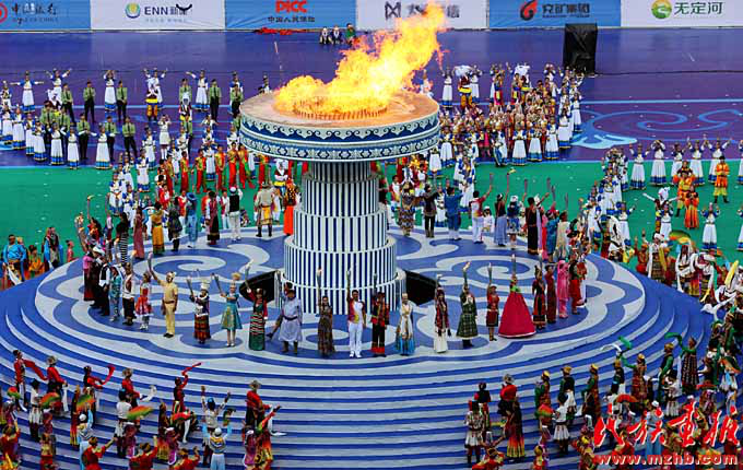 鄂爾多斯集團的發(fā)祥地伊克昭盟在2001年改為鄂爾多斯市,改革開放以來經(jīng)濟社會迅速發(fā)展,2017年中國地級市全面小康指數(shù)排名第九。2015年第十屆全國少數(shù)民族傳統(tǒng)體育運動會在鄂爾多斯市舉辦,這是開幕式現(xiàn)場(列來拉杜 攝影)