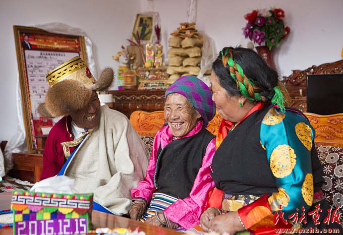 村民尼瑪一家,前排的編織物記錄了他們搬遷新居的日期(黃若天 攝影)