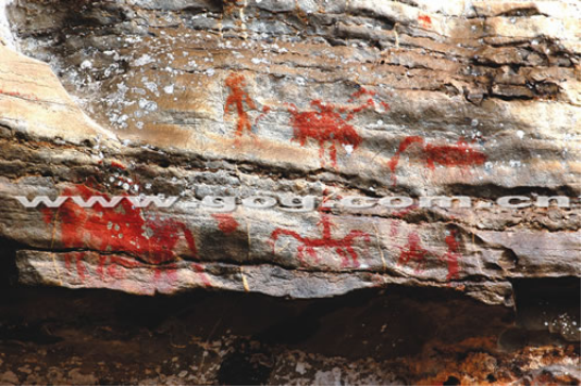 值得一提的是巖畫中的個(gè)體人物幾乎人人頭頂都有一支羽毛狀的頭飾,背上掛有披肩,類似今天的苗族傳統(tǒng)服飾,其中的頭飾藝術(shù)使得這里的巖畫充滿了躍動的生命感。巖畫色彩是純一色的紅色,視覺沖擊力極強(qiáng),這里的巖畫圖像都充滿著愉快的生活氣息,呈現(xiàn)出一股浪漫主義的藝術(shù)風(fēng)格。這些巖畫表現(xiàn)出強(qiáng)烈的寫實(shí)風(fēng)格和民族風(fēng)格,生動、形象地記載、反映了當(dāng)時(shí)人民的生活狀況、生產(chǎn)力水平和宗教信仰等,整個(gè)巖畫群完全如同一部記載民族風(fēng)情的史書,反映了遠(yuǎn)古先民進(jìn)入貴州、拓土興邦的歷史,是填補(bǔ)貴州歷史空白的重要史料。