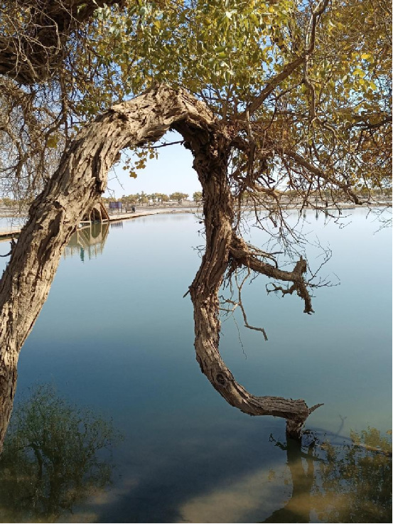 每當(dāng)深秋季節(jié),胡楊樹(shù)葉變得一片金黃,形成胡楊秋色,樹(shù)影婆娑,奇妙絕倫,賞心悅目。漫步在濃郁的胡楊林中仿佛進(jìn)入神話般的仙境。茂密的胡楊千奇百怪,神態(tài)萬(wàn)般。粗壯的幾人難以合抱,挺拔的七、八丈之高,怪異的似蒼龍騰越,似虬蟠狂舞,令人驚奇不已,嘆為觀止。僅就密密匝匝的樹(shù)葉,也是風(fēng)采獨(dú)有。幼小的胡楊,葉片狹長(zhǎng)而細(xì)小,宛若少女嫵媚的柳眉,人們常常把它誤認(rèn)為柳樹(shù);壯齡的胡楊,葉片又變成卵形、闊卵形或三角形,猶如興安嶺的白樺;進(jìn)入老年期的胡楊,葉片才定型為橢圓形。更令人稱奇者,在同一棵胡楊樹(shù)冠的上下層次,還長(zhǎng)著不同形狀的葉片,因此,又稱“異葉楊”