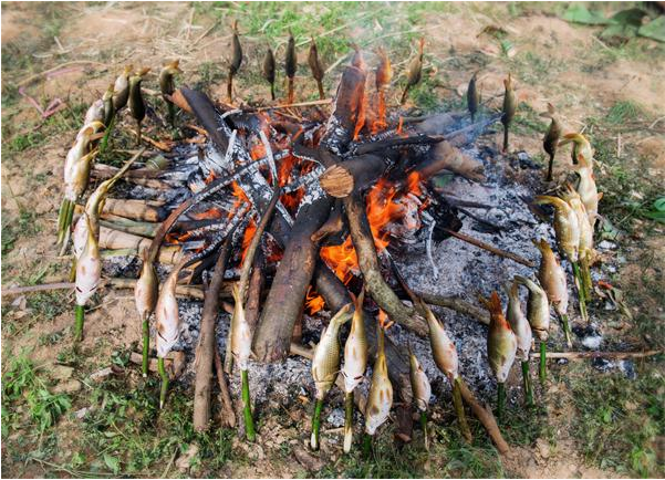 說起燒魚,得從古代人類祖先燒肉燒魚談起。苗族先輩們?cè)陂L(zhǎng)期的遷徙跋涉中,或到西南方向的崇山峻嶺定居后,都要到山下水塘、溪流中捕捉蛙魚來充饑,維持生活。由于沒有鍋頭和碗具,只能燃燒篝火紅炭來燒烤蛙、魚至熟,然后上山采摘蕉葉、芒草來墊盛,大家圍攏在一起一同享用,久而久之便形成了野炊燒魚的習(xí)慣,一直流傳至今。
