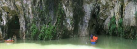 水洞長(zhǎng)1000余米,半是人工半天然,登舟入洞,借助稀疏的燈光和導(dǎo)游的手電筒辨認(rèn)著一處一處各各不同的景物,頗有一點(diǎn)神秘之感。洞盡船出,豁然開(kāi)朗,但見(jiàn)茂竹修篁叢叢簇簇,一泓綠水微波不興,野趣天成,靜謐無(wú)聲,此處名“竹林翠溪”,宛如一世外桃源。旱洞共三層,滿布著形態(tài)各異的石鐘乳、石筍、石柱、石幔,其第三層洞廳軒敞,一座天然石橋飛架兩懸崖間,人稱“奈何橋”,橋下即是深不可測(cè)的陰潭,景觀之奇特,令人叫絕。旱洞出口處,有苗寨一座,是專為旅游者興建的,游人盡可在此親身體驗(yàn)一次苗家的婚俗。