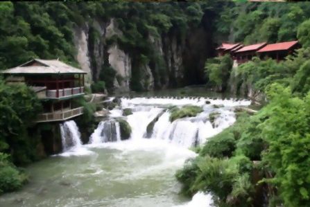 水洞下游有臥龍湖,水清可鑒,湖邊排列著水車、水碾、水磨、“香粑車”等等往時(shí)鄉(xiāng)間常見(jiàn)的農(nóng)家物,給人以既古樸又清新的感覺(jué)。與臥龍湖相連的是一處罕見(jiàn)的鈣化灘,足有200米長(zhǎng),灘面上瀑布流瀉,水簾溶洞星羅棋布,植被茂密,堪稱喀斯特景貌的一絕。這一帶,春來(lái)桃花爛漫,夏臨蘭草吐芳,金秋野菊盛開(kāi),初冬火棘紅艷,一年四季,風(fēng)景如畫。