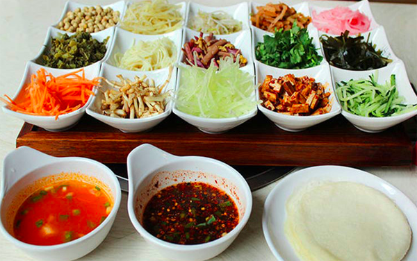 制作方法:烙。面粉加水,鹽少許揉勻搟透(水與面粉比例為1:6),平鍋燒熱刷油、擦干,然后左手抓起面團(tuán)甩圓并向鍋底杵一下成為直徑為9厘米的圓薄皮時,右手立即把圓形面皮揭起,這樣制作數(shù)十張春卷皮,放入蒸籠稍蒸一下使其回軟,便于包食。再將綠豆芽、海帶絲、芹菜節(jié)、蕨菜節(jié)用開水氽過,分別裝入小盤中,小碗內(nèi)放入醬油、醋、味精、麻油、姜沫、蔥花、辣椒兌成汁。春卷皮中放入各種素菜絲包成上大下小的兜形,放入酥黃豆或油炸花生,澆淋兌好的辣椒汁即成。