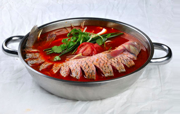 二、苗族人民自制的酸湯來(lái)煮的魚(yú),酸湯是用清米湯發(fā)酵后制成的,有酸甜爽口味,是一種極好的調(diào)味品,煮酸湯魚(yú)的時(shí)候,將去膽的鯉魚(yú),放入已煮沸的酸湯中,熟透起鍋前放入適量鹽、姜、生花椒和魚(yú)香菜等調(diào)料,5分鐘后把煮熟的魚(yú)夾進(jìn)菜缽,剔去魚(yú)刺,再把胡椒面、鹽、蔥花、蒜泥、番茄(番茄先在火上烤去生味,然后剁成醬作調(diào)料)調(diào)勻,倒入魚(yú)肉拌勻后食用。魚(yú)肉鮮香細(xì)嫩,麻辣酸香多味俱全,營(yíng)養(yǎng)豐富,增添食欲,幫助消化。